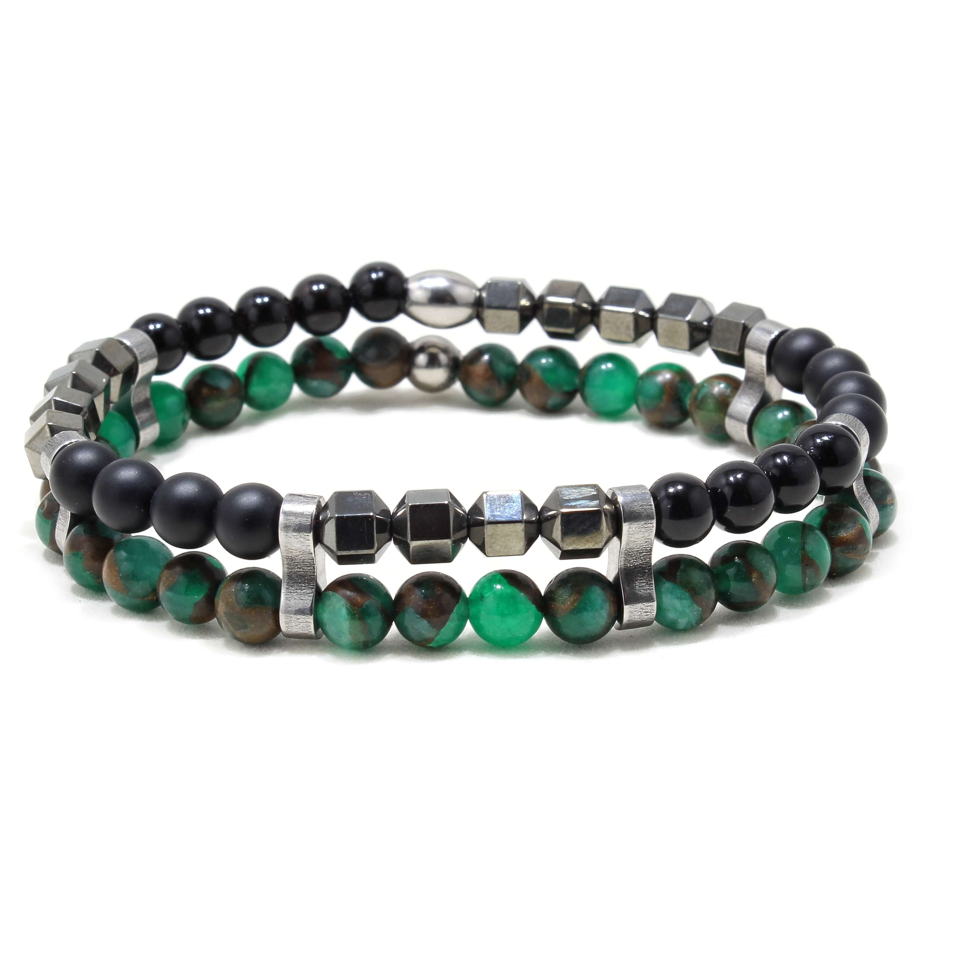 Bratara este realizata manual, din pietre naturale Onix, Hematite ,Calcedonie 6 mm, elastic foarte gros si piese din otel inoxidabil.