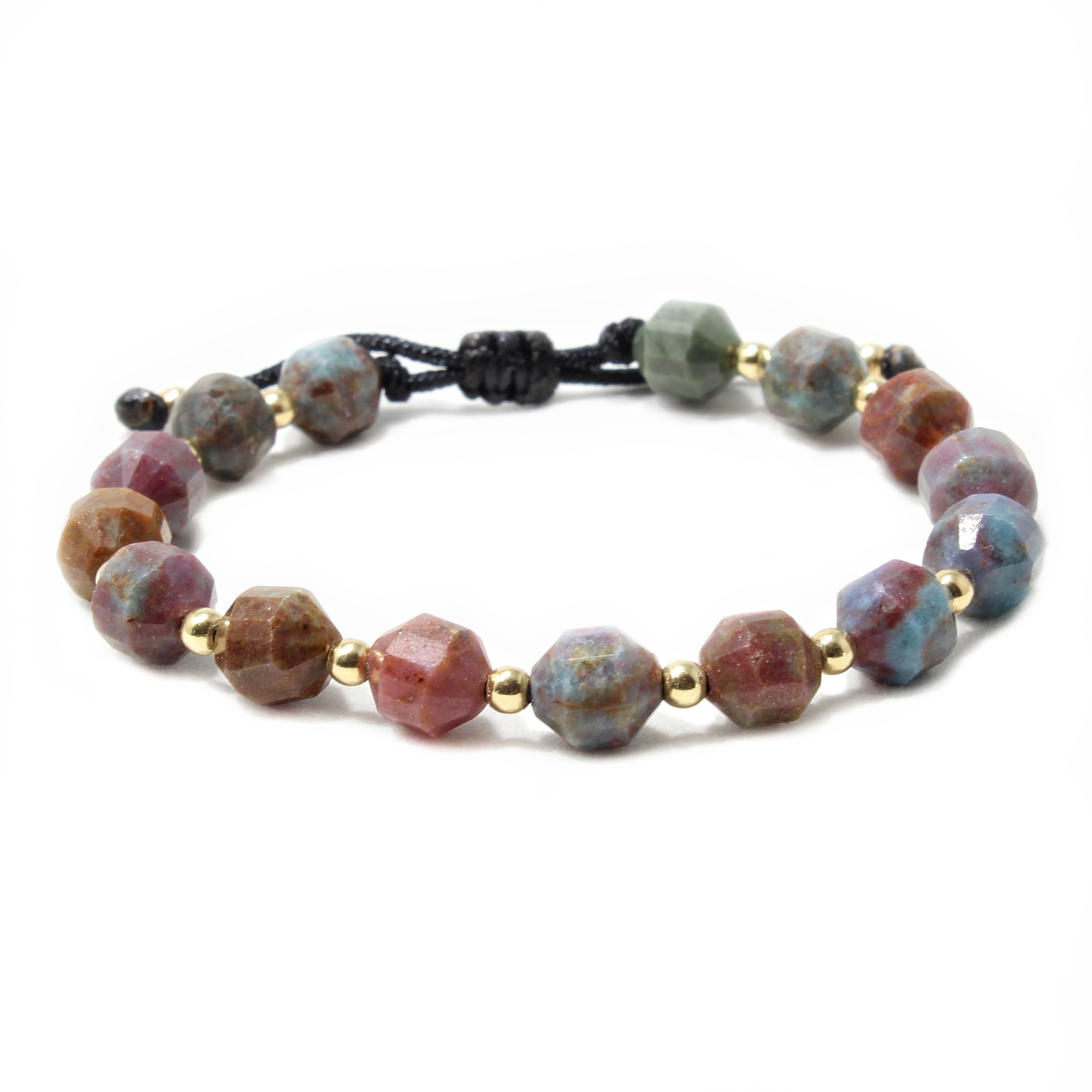 Bratara este realizata manual, din pietre naturale semipretioase Red Corundum Ruby & Sapphire, bilute 3 mm din Aur 585 de 14K si snur special de inalta calitate.