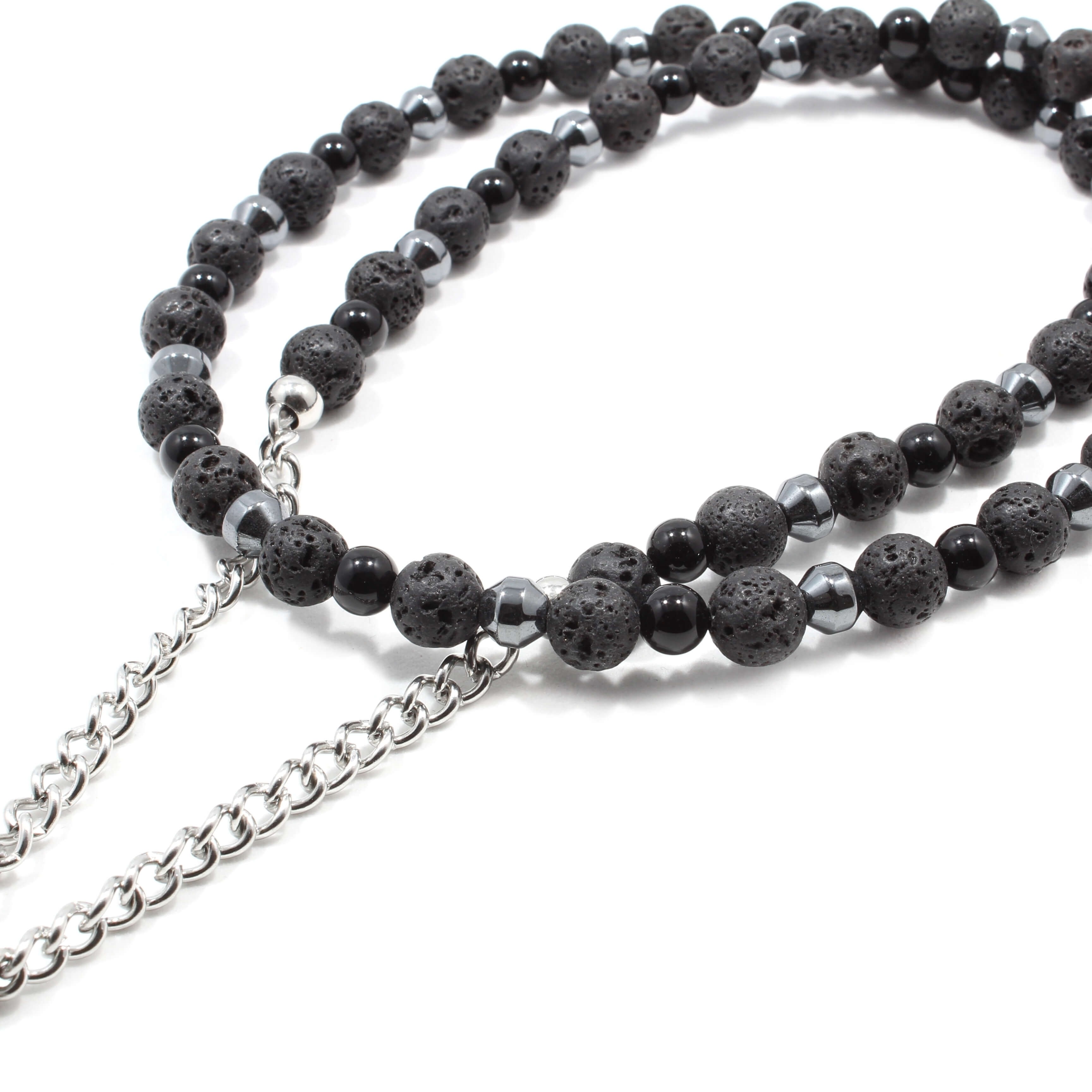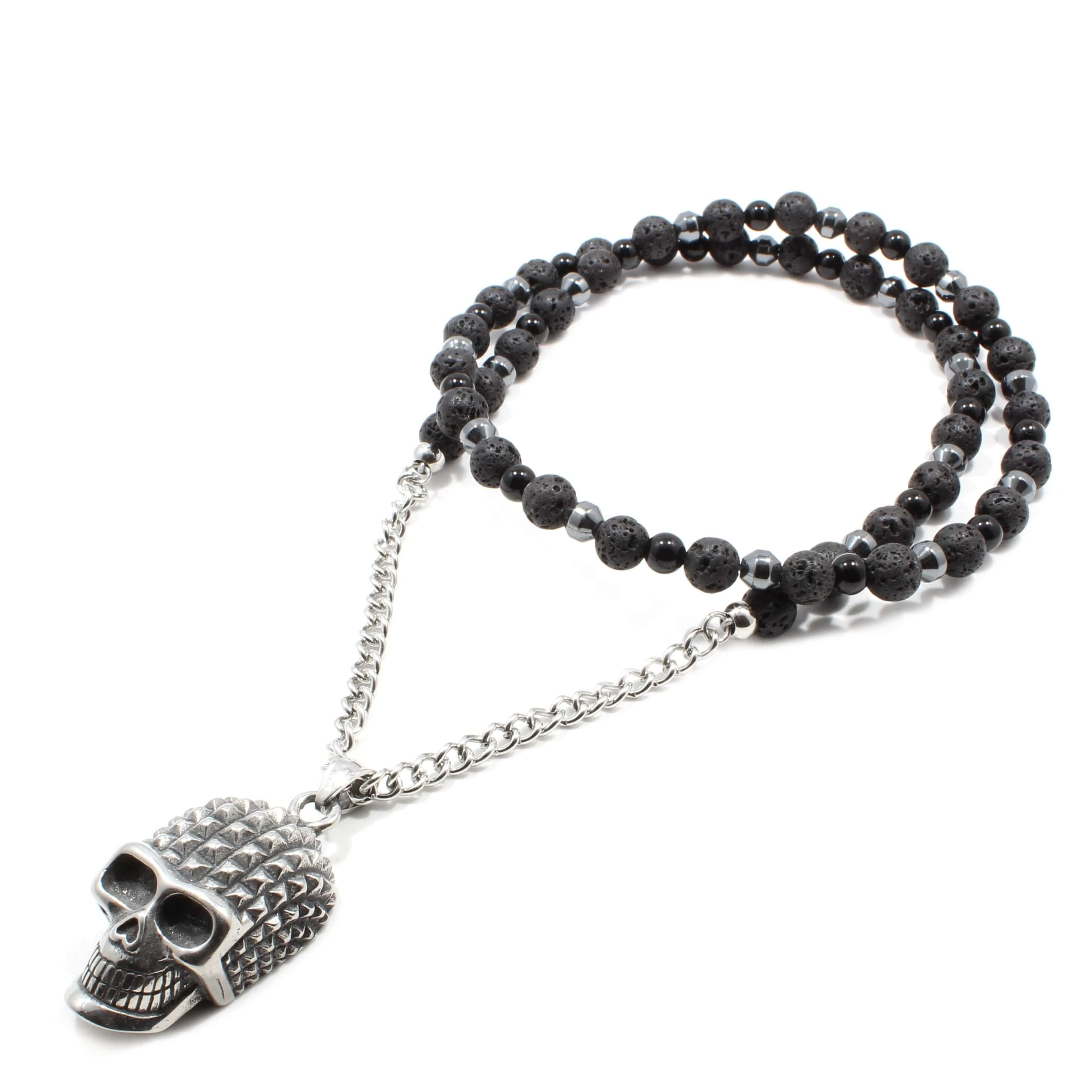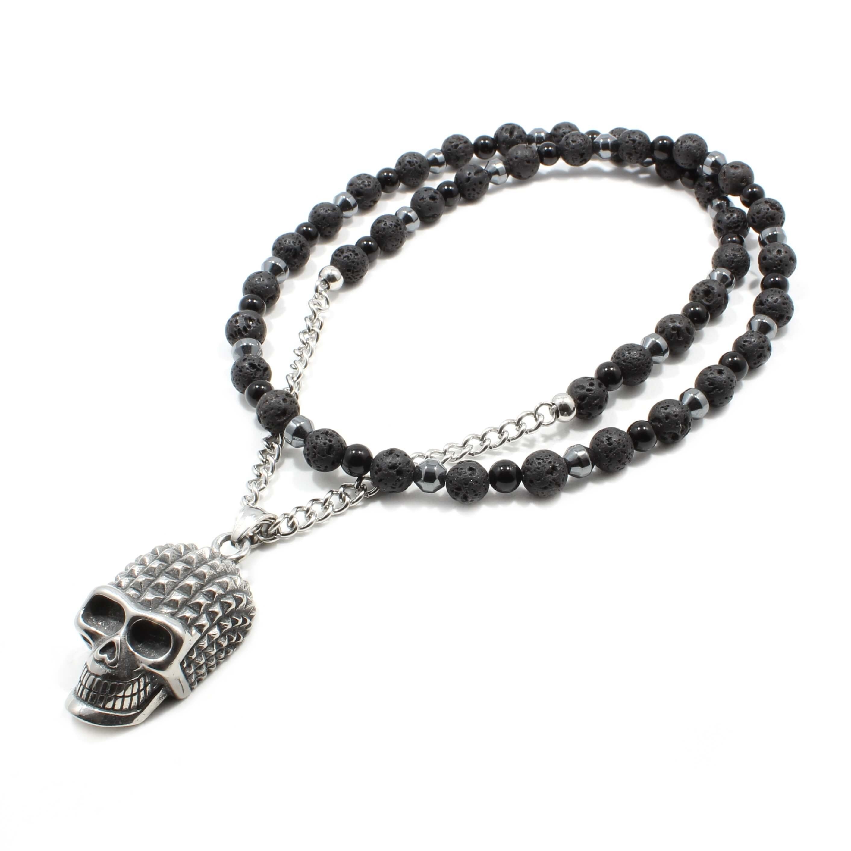Lant Alien Skull, Tios handmade, pietre naturale vulcanice, Hematite si Agate, pandantiv craniu din otel inoxidabil, ~72 cm