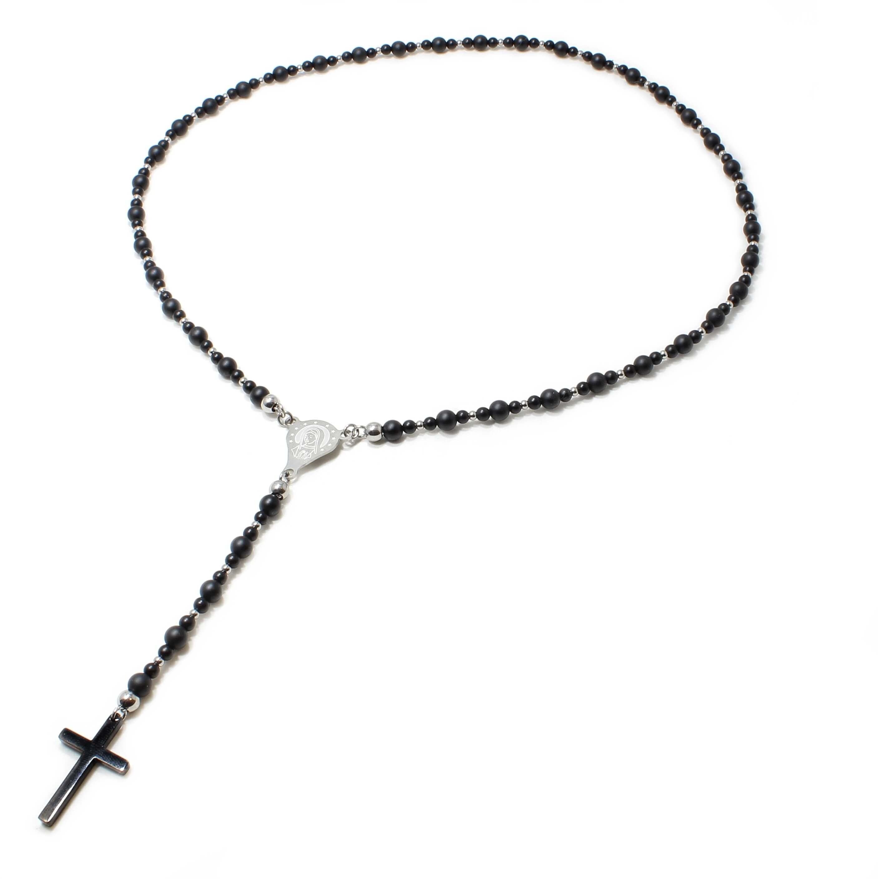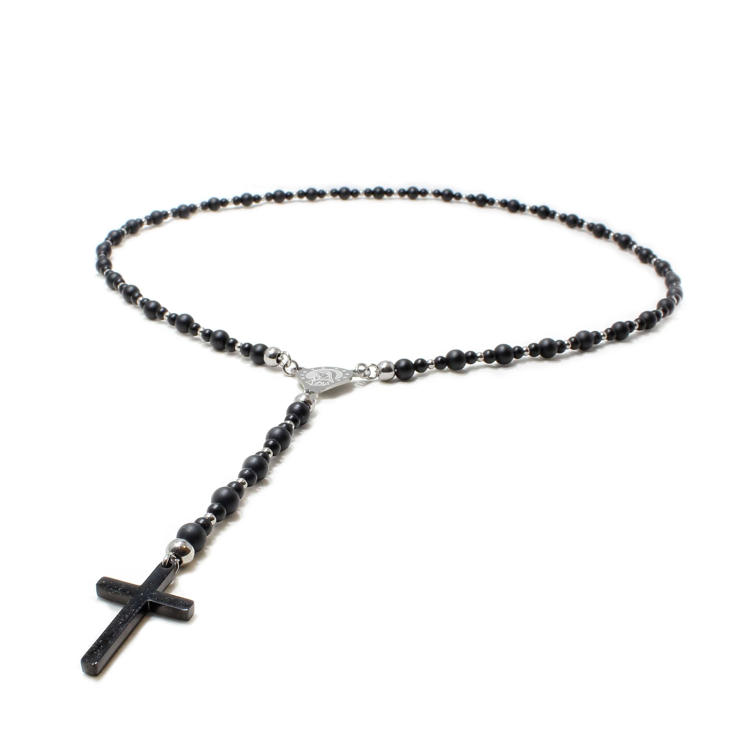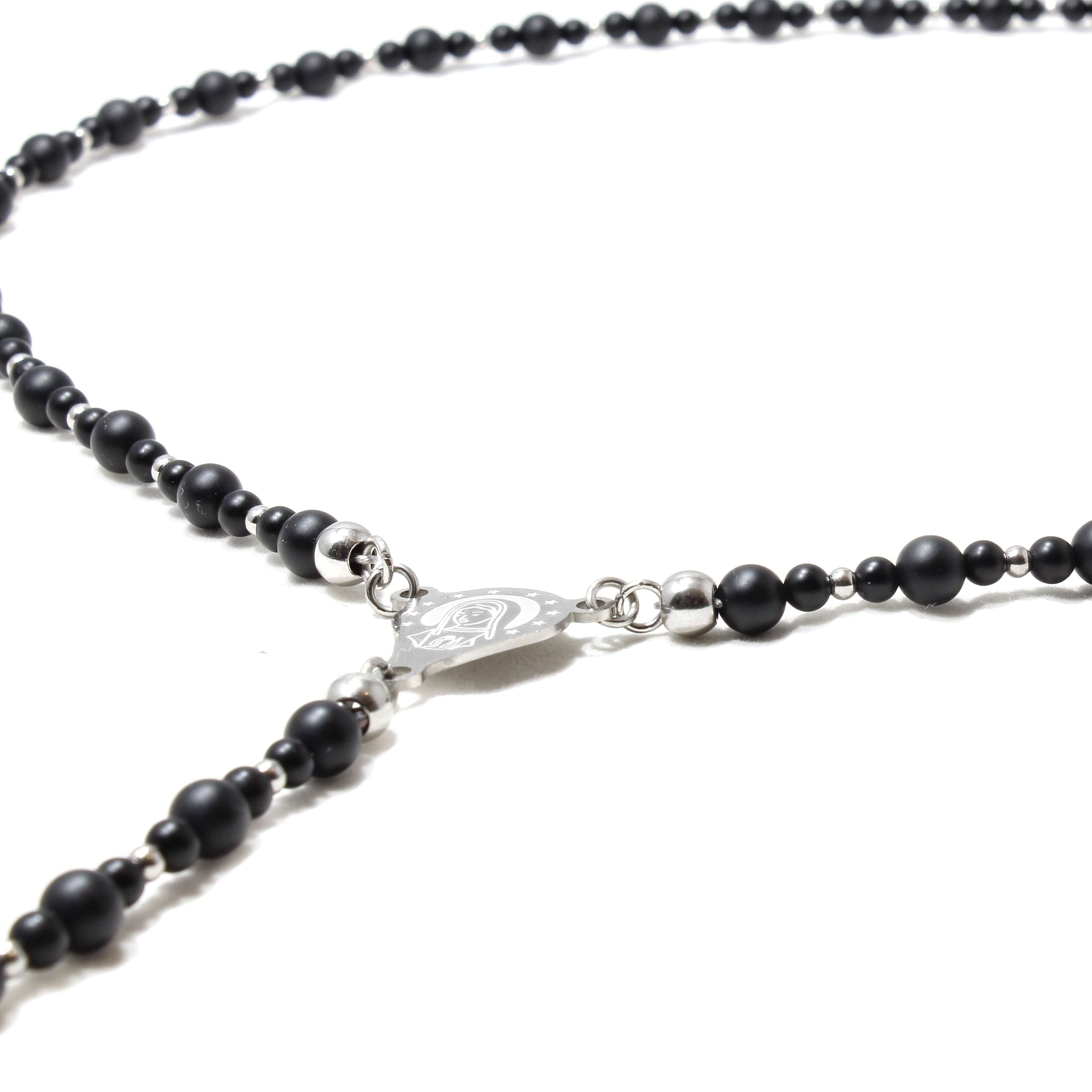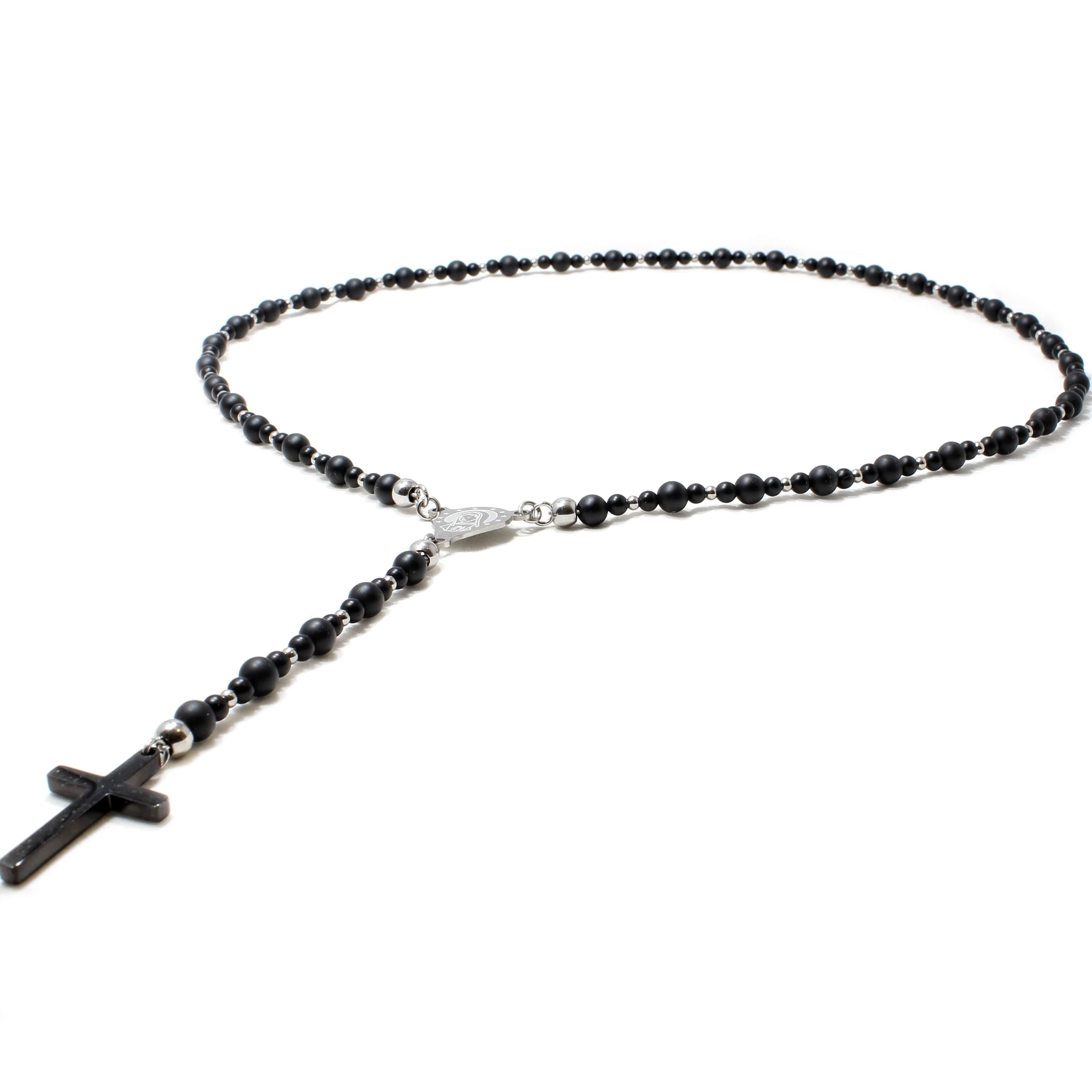 Lantul este realizat manual, din pietre naturale Onix, otel inoxidabil si pandantiv cruce.