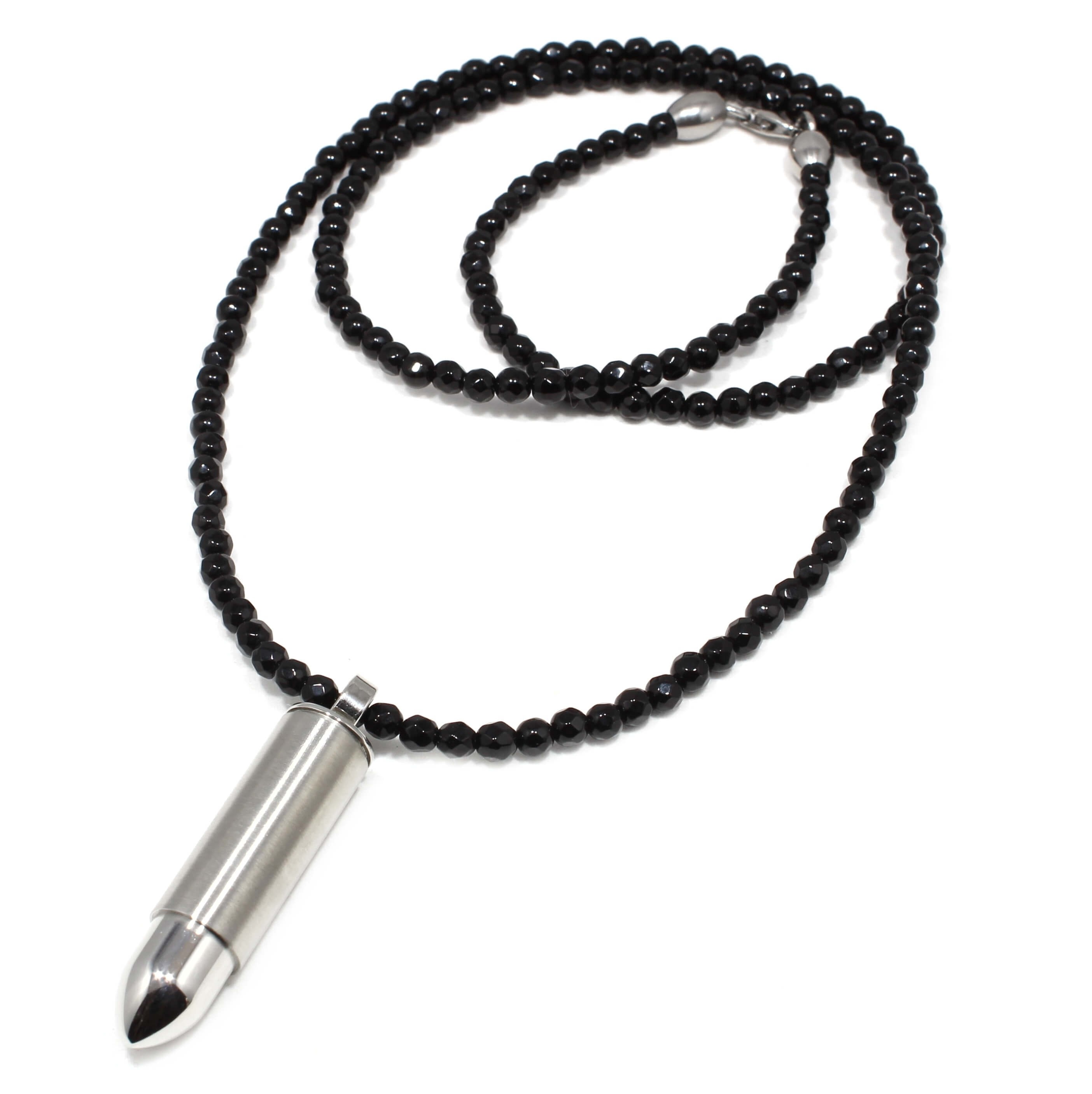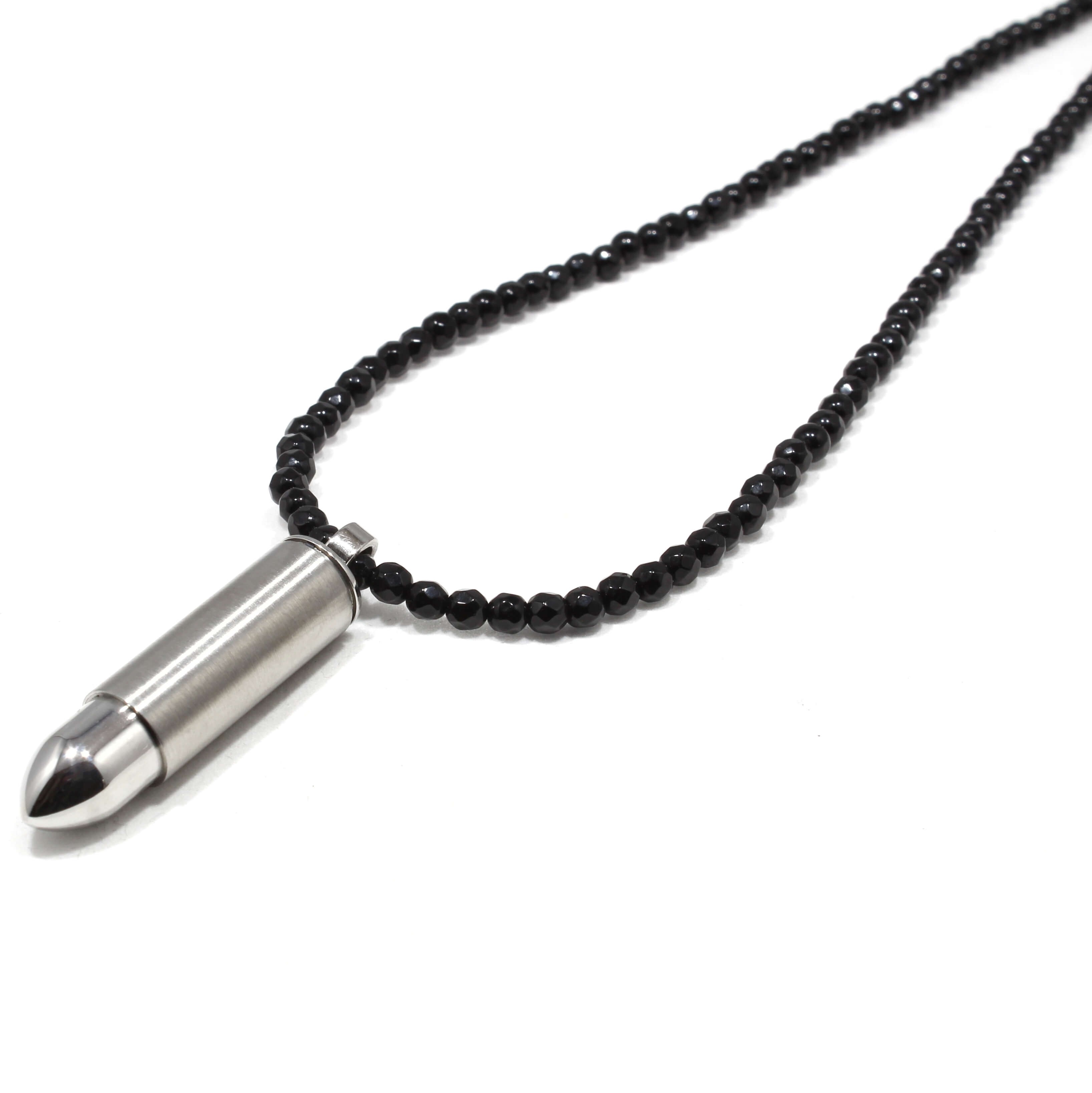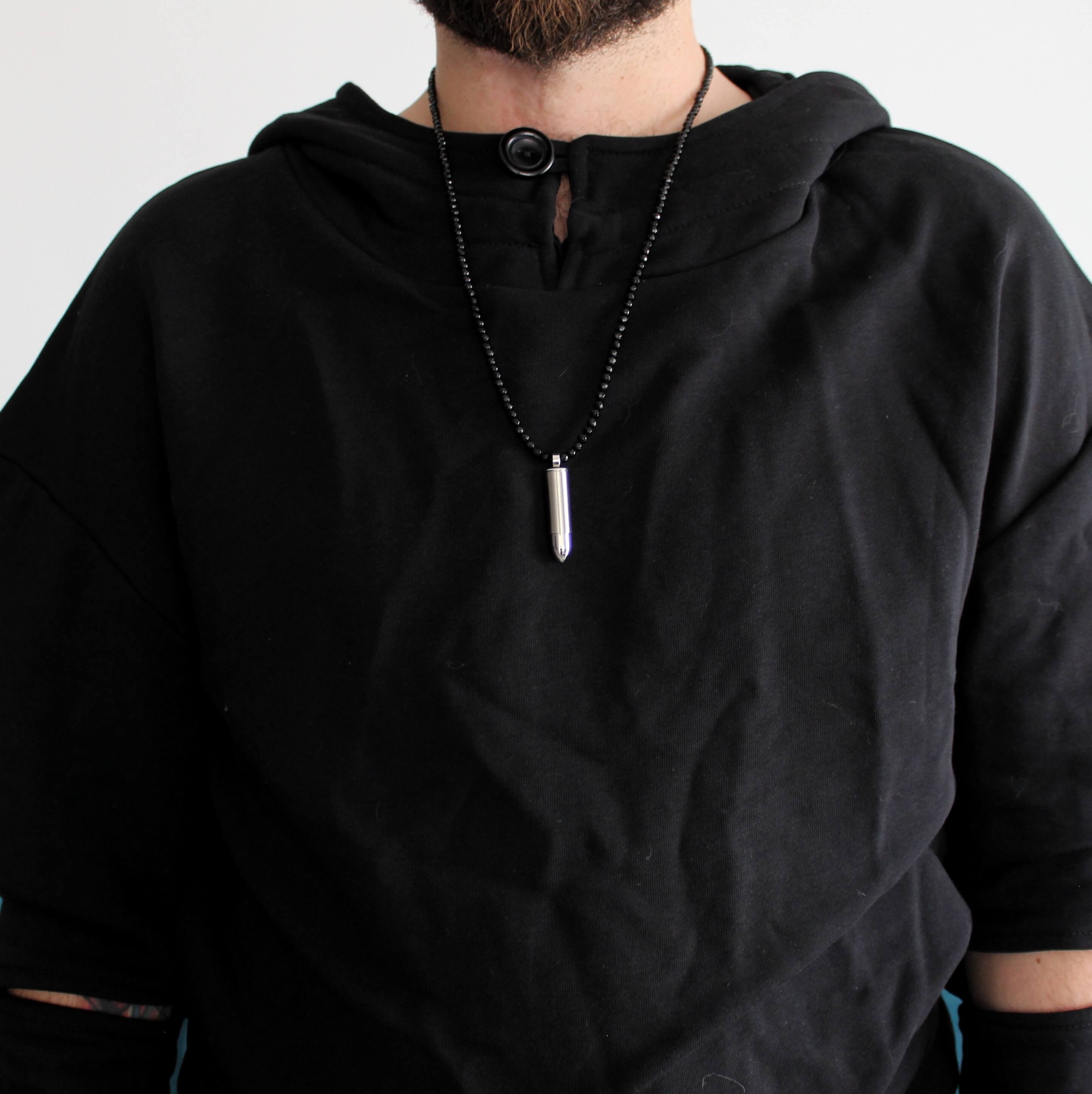 Lantul este realizat manual, cu multă pasiune și dedicare pentru cei care vor purta accesoriul, din pietre naturale Agate, pandantiv glont recipient din otel inoxidabil. Are un design unic, original și o versatilitate specială. Poate fi purtat atât la ținute casual cât și la cele smart-casual.