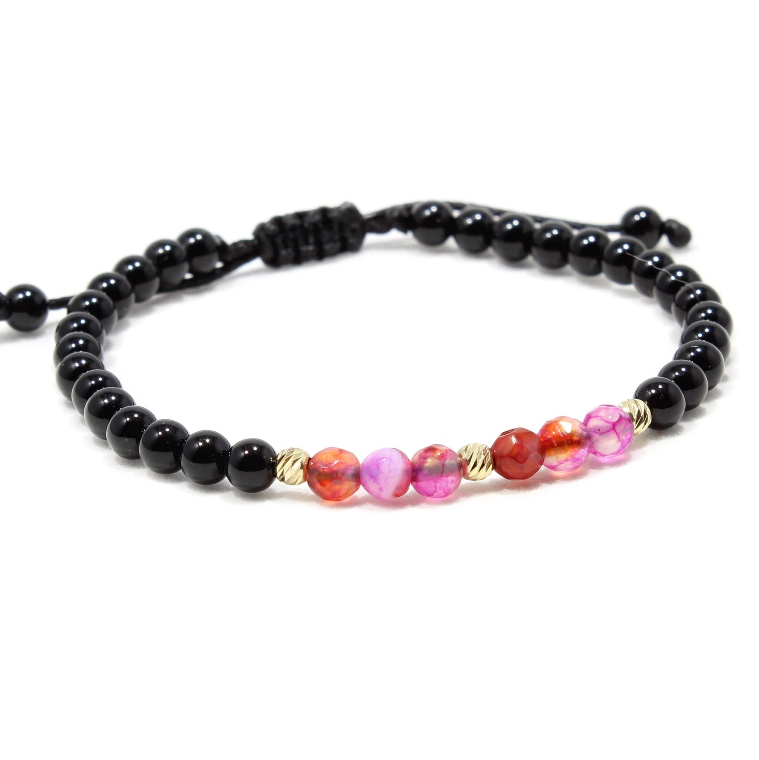 Bratara este realizata manual, din pietre naturale semipretioase Onix, Crackle Agate, bilute 2.5 mm si 3 mm din Aur 585 de 14K si snur special de inalta calitate.